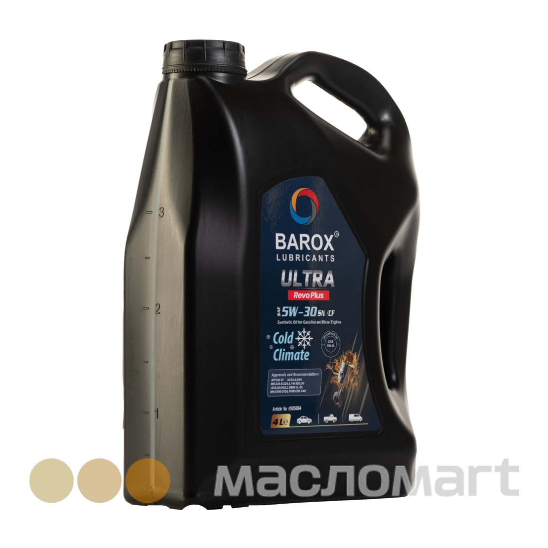 BAROX ULTRA REVO PLUS 5W-30 API SN/CF ACEA A3/B4 –первоклассное, современное моторное масло с низким коэффициентом трения. Подходит для эксплуатации круглый год. Сочетание современных синтетических базовых масел и новейших технологий присадок позволило создать продукт, гарантированно снижающий расход масла и топлива, обеспечивая при этом быстрое проникновение масла в двигатель.